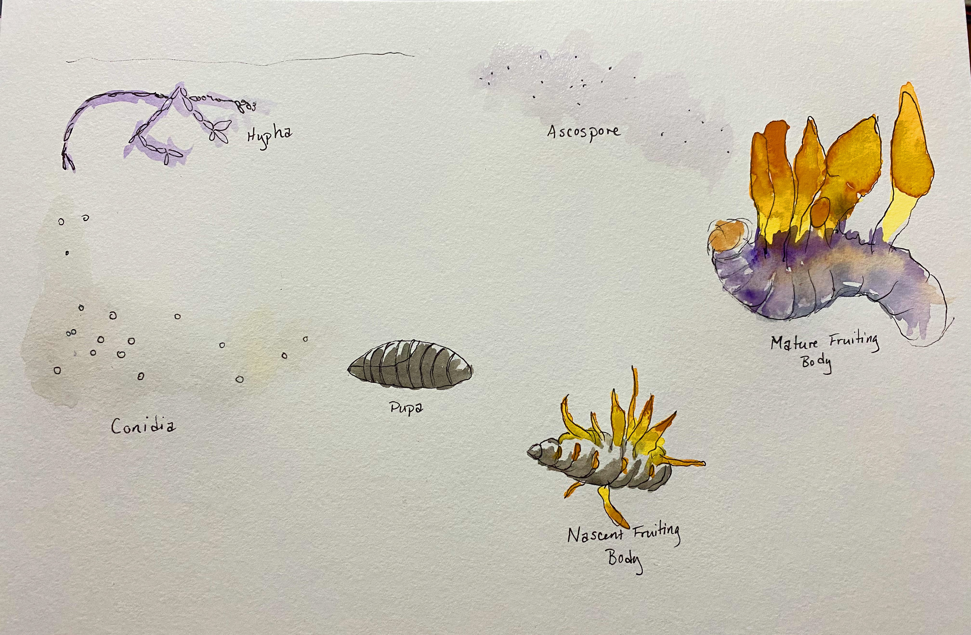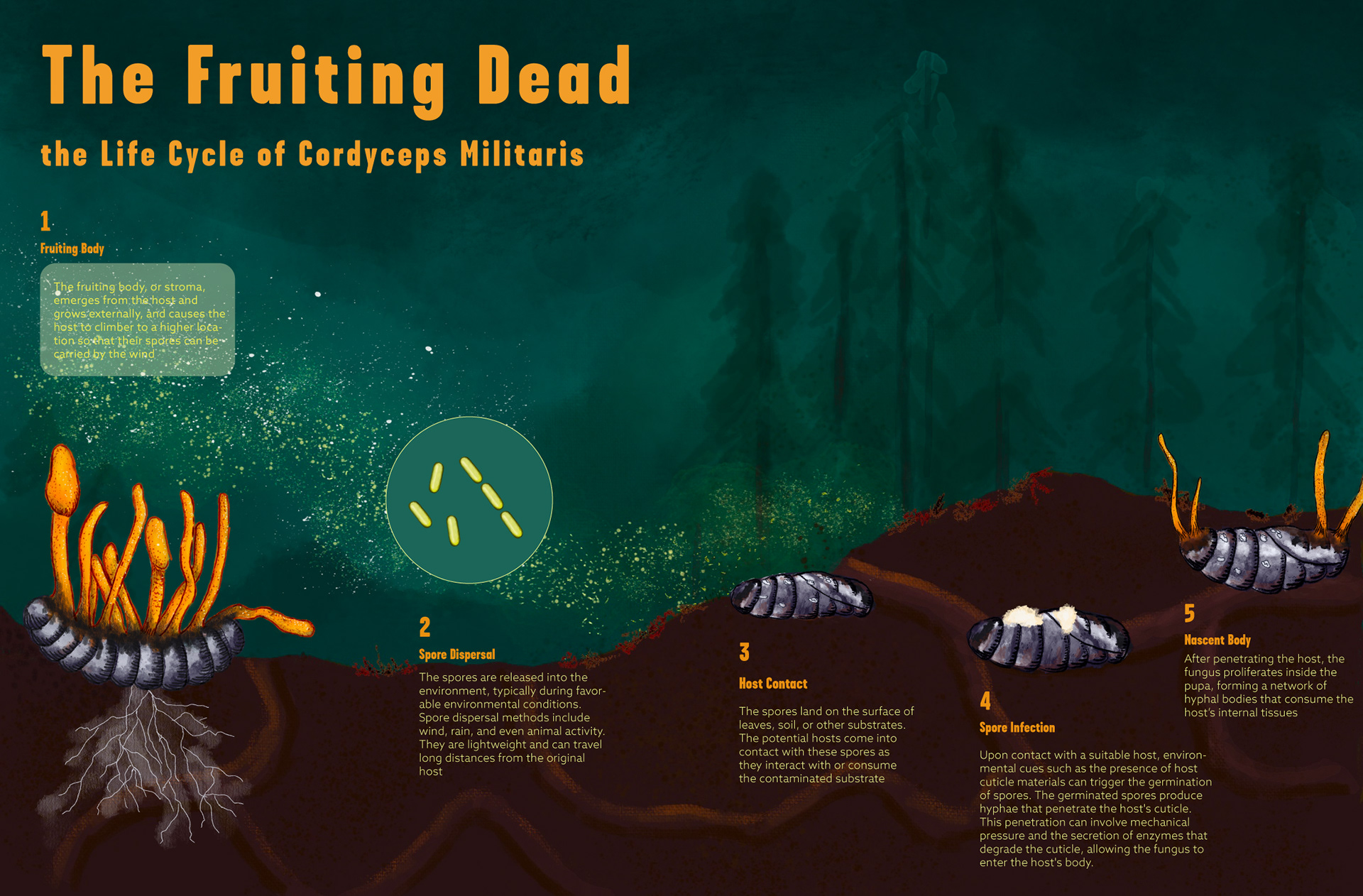This life cycle poster was created as a part of the BMVC certificate at UBC, and it shows the life and reproductions pf a fungi known to those who have watched the TV series or played the game The Last of Us.